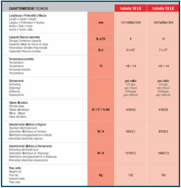 Isabella uiterlijke kenmerken goede prestaties, maximale ruimte voor ijs presentatie. Dankzij de dubbele verdamper kan er containers van 5 liter worden gebruikt. Met een T vorm kan er ook containers van 4,75 liter geplaatst worden in een dubbele rij. Dit betekent optimalisatie van de ruimte voor de weergave en een gelijke verdeling van de temperatuur in de tank, ook een hoge luchtvochtigheid. |
